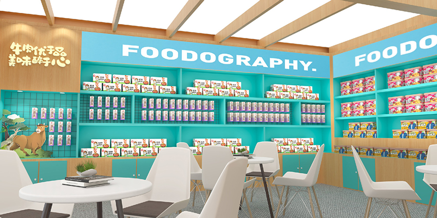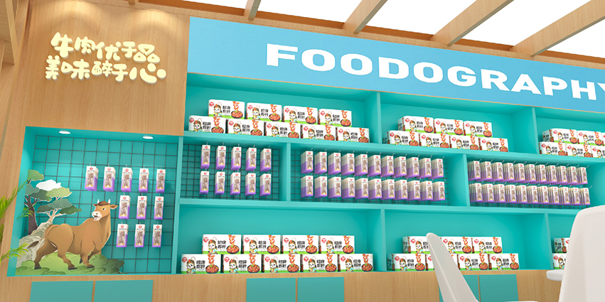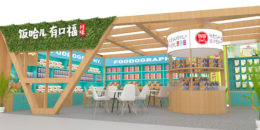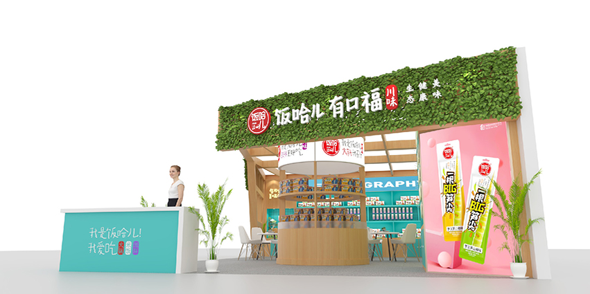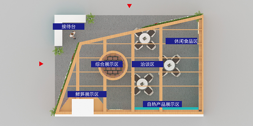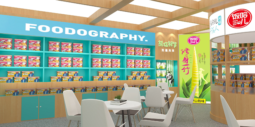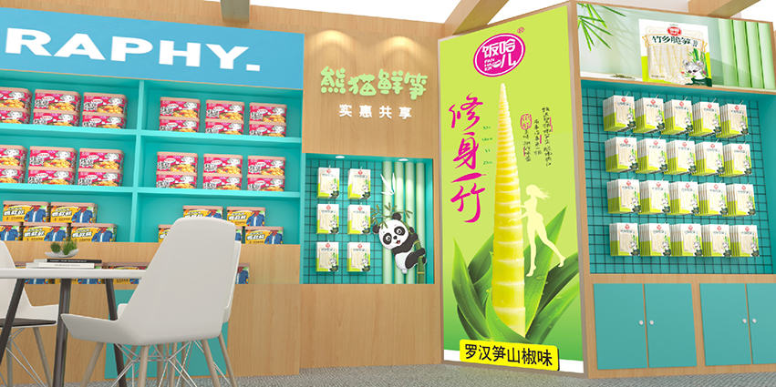 健康。因为本次展台在酒店内,观展人群众多,所以本次展台采取一个二面开口的开放式布局,使其能大量的容纳观展人群。功能布局上设置有鲜笋展示区、洽谈区、休闲食品区、自热产品区,接待区使整个展台功能完整。展陈内容上主打竹笋、牛肉等休闲类食品、自热食品类.
